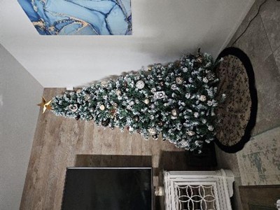 I was a little nervous to buy this tree online but trusted the reviews that were already posted. When it arrived I was actually very impressed with it! I love the acorns and the fake snow. Some of the fake snow does chip off while assembling the tree and fluffing it but not a big deal. We used the start method while fluffing it and it gave it a fuller look. It was a bit bigger than I expected. I’m so happy with the purchase.