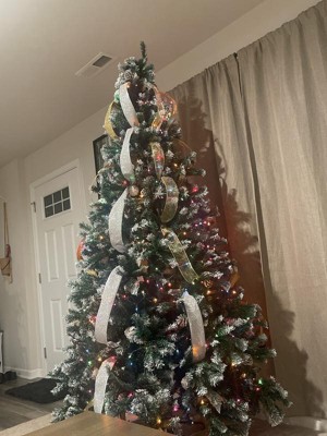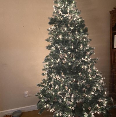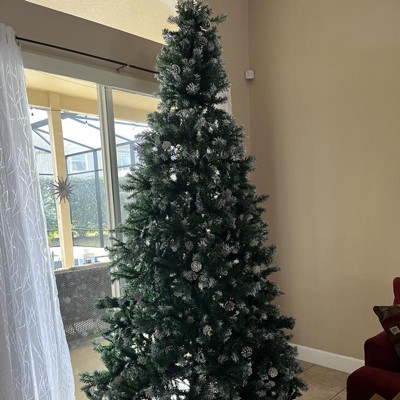 I really Love this Tree! It is even more Beautiful in person. I got the 7.5 foot Tree on sale for $89.99 on Target.com. It said it would take about 10 days to get here and got here in 2! As long as you take the time to fluff out the branches, read the instructions on how to arrange each branch, it will come out gorgeous, without any gaps. It took about an hour with 2 people. Each branch has frosted tips and a pinecone on the ends. The pinecones are nicely secured by a wire and most need to be adjusted or flipped over. The Tree looks Beautiful even without lights or ornaments. The only Drawbacks (which I'm totally fine with) are: - The branches are best with very light ornaments. Heavier ornaments are a little hard to hang on. - It was really hard to put the star on top, it kept falling, the branches aren't sturdy enough. I was able to put a chopstick inside the star holder and then arrange the branches behind it and it's staying up now. However, if you move or shake the tree, the star falls. Maybe my star is too heavy. - The last thing is my ornaments kind of blend in with the tree, but that's not an issue with the tree. I have bronze, gold, silver, and white ornaments. I'm going to buy some turquoise colored ornaments to add some pops of color. This is my first fake tree and I am beyond happy with it! It is Gorgeous! Also, for reference, we have 9 ft. Ceilings.