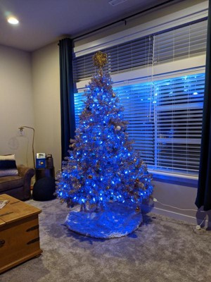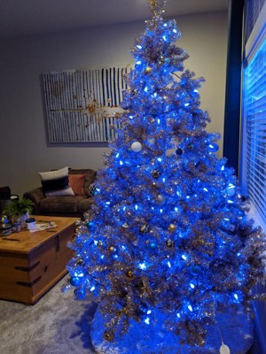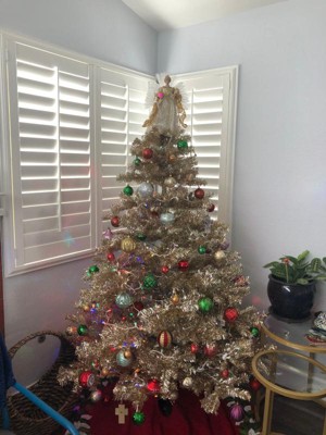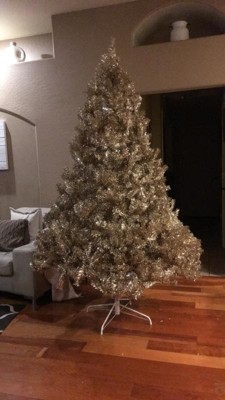 I have been looking for a while for a gold tinsel tree. This one is the perfect gold. It was so easy to assemble. Just three pieces, plus the stand. The branches just needed some fluffing. I got the 7.5 foot and I love how big it feels. It does shed some initially when your fluffing it but not much after that. This tree does not have lights but I like that I don’t have to worry about them going out. I also like the idea of using it without them. If I add them on I will use some with white string. I can’t wait to decorate it.