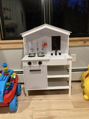 This charming farmhouse-style kitchen playset features classic, realistic details that spark hours of imaginative play. It includes a pretend sink, stove, oven, and chalkboard, all designed with fun accents like side windows and clicking cabinet knobs, creating a unique and inviting atmosphere. Kids can keep their favorite accessories organized with open storage in the oven and beneath the sink, while hooks on the backsplash provide easy access to utensils. The set also includes three cooking utensils, a pot, and a pan to complete the play kitchen. This playset is constructed with ASTM- and CPSIA-certified materials and ensures long-lasting and safe adventures. Simply follow the included manual, and you'll have a reliable and sturdy setup for your little chef in no time!