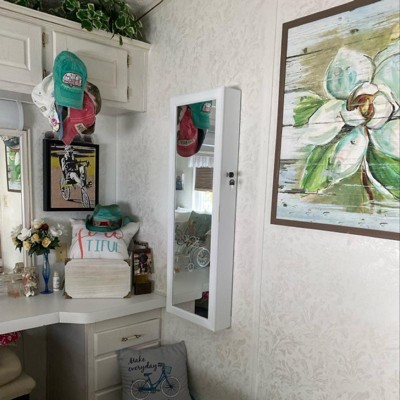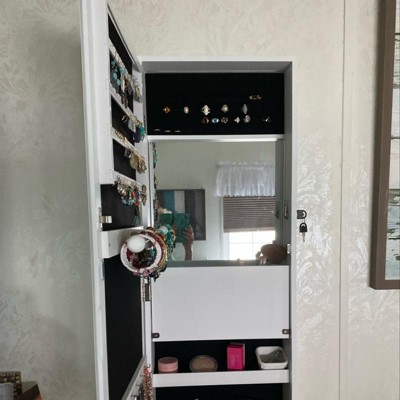 This mirror is exactly what I needed. My only issue is that I am really short and my door happens to be very tall! I’m able to make it work though, the lighted make up mirror is an absolute game changer and the jewelry storage is perfect.