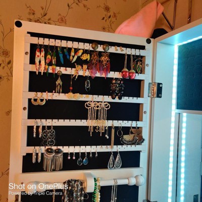 Brighten up your look with this hanging LED jewelry armoire. Multiple necklace hooks, over 100 earring slots, and much more storage space allow you to keep all your jewelry and cosmetics neatly organized. Plus, the interior LED light adds style and the convenience of finding jewelry easier. Mount it on a door or the wall to save floor space!