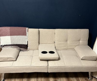 Best Choice Products Modern Linen Convertible Futon Sofa Bed w/ Removable Armrests, Metal Legs, Cupholders - Beige
