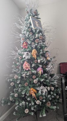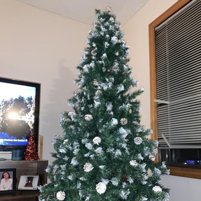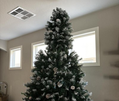 I really Love this Tree! It is even more Beautiful in person. I got the 7.5 foot Tree on sale for $89.99 on Target.com. It said it would take about 10 days to get here and got here in 2! As long as you take the time to fluff out the branches, read the instructions on how to arrange each branch, it will come out gorgeous, without any gaps. It took about an hour with 2 people. Each branch has frosted tips and a pinecone on the ends. The pinecones are nicely secured by a wire and most need to be adjusted or flipped over. The Tree looks Beautiful even without lights or ornaments. The only Drawbacks (which I'm totally fine with) are: - The branches are best with very light ornaments. Heavier ornaments are a little hard to hang on. - It was really hard to put the star on top, it kept falling, the branches aren't sturdy enough. I was able to put a chopstick inside the star holder and then arrange the branches behind it and it's staying up now. However, if you move or shake the tree, the star falls. Maybe my star is too heavy. - The last thing is my ornaments kind of blend in with the tree, but that's not an issue with the tree. I have bronze, gold, silver, and white ornaments. I'm going to buy some turquoise colored ornaments to add some pops of color. This is my first fake tree and I am beyond happy with it! It is Gorgeous! Also, for reference, we have 9 ft. Ceilings.