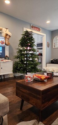 I based my purchase on good reviews but this tree isn't it. I had a 6.5' 1500 tip tree that I got rid of when I purchased this 6' 2000+ tip tree. In theory, this would be more full as it is shorter and has more tips but it is somehow so much less full... maybe the tips are shorter or not well placed. I fluffed for awhile the first time and was unhappy. I bought some extra green garland, white garland, and berries to try to fill it in and fluffed for another bit of time...added some snow and it's better but not nearly as good as my old tree. Second picture is with changes. I'm sure it will be better with the ornaments but it's just not the best tree.