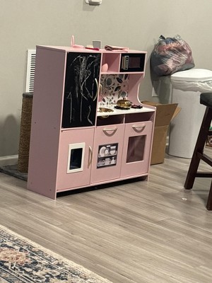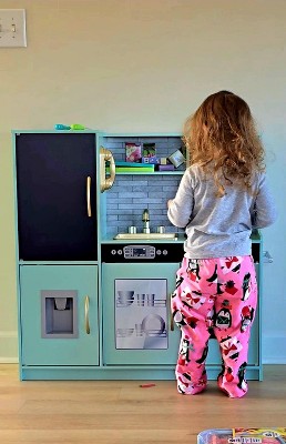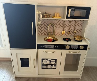 This kitchen is absolutely beautiful. It is very modern and I love the gold features. Putting it together was definitely a headache because I’m not good at putting things together, but it was a two person task and we got it together and probably 2 1/2 hours on Christmas Eve. The directions were pretty straight forward. The kids absolutely love it. My five year old is the perfect size for her (even though I hoped it would be a lot bigger. There’s a refrigerator and oven and places to store the food. Definitely a great buy. 8 months later and it’s still extremely sturdy.