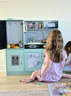 This was super upsetting. It was purchased as a birthday gift for my 3 year old. The color isn't even remotely accurate. We received a color that resembles 50s teal with ugly grey subway tile instead of the advertised Sage Green with White Herringbone. Color aside, assembly was atrocious. As someone who's assembled half a dozen Kidkraft kitchens, this one was a HUGE pain in comparison. It took approximately 3 hours, which is insane for how small it is. My 6 year old plays sitting on the ground or on her knees because it's so tiny. The counter is at my 2 year olds waist. who wants a play kitchen they're going to grow out of quickly? Such a disappointment.