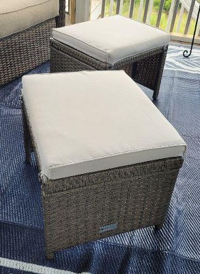 Style and convenience is making their way to your patio in the form of this ottoman set. Use this versatile set to create additional seating for any existing furniture in your backyard or garden. Further versatility allows you to remove the cushions and set them up for use as side tables. Weather-resistant material includes durable wicker woven over a sturdy steel frame, while machine-washable cushion covers keep them looking their best. Securely strap the detachable cushions around the seat top to prevent slipping as you lounge, and neatly tuck the ottomans away to save space until the next use.