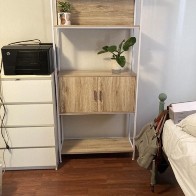 Enhance your living space with a bookcase swimming in versatility. Built with enclosed storage, its cabinet doors conceal a spacious area to store books, magazines, and more! An elevated design also allows for a robot vacuum to slide underneath and clean the hard-to-reach areas. Indulge in a versatile setup; add another bookcase to your living area for more ways to clear clutter and create a decorative space that's your own. Plus, you can make the most of the tall shelf space and display your favorite keepsakes and other items that tower above the rest. Quality materials, including melamine boards and a sturdy metal frame, keep it intact while adjustable feet help keep it sturdy. For placement purposes, overall dimensions are 32(L) x 12"(W) x 70"(H). Open sections are 17" tall apiece, while the cabinet is 14.5" and the top shelf 13.5"."