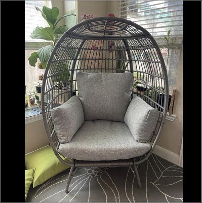 I love this chair! I fell in love with the design when I first saw it as a patio in store display 7 years ago! So, what do I like? It’s like a cave! For me! I fits me and probably another but that’s debatable because I don’t know if I can share space well. ;p the love the medium color gray I got, but I wish the inside frame was gray too. It’s huge! When I got the box I was skeptical about how can this cave fit in the box! Of course, once I opened the box I knew it was another Lego-like project. I love putting stuff together. The pieces were labeled and the directions clear-ish but I would have liked the directions to be more detailed. I used my own tools since these are not my first furniture to put together. I would recommend two more additional tools to this set. I gotta say it would be easier with 2 people putting this together but with me alone and the weight and shape of it, it took me 2 hours to put together, not 30 minutes. I did have to do some rescrewing some than once because of the aesthetics and the wrap material that makes it wicker-ish and can be chipped off by a washer placement. I’m 5 feet 4 inches at 111 lbs so it’s a great size for me. It’s my reading nook with all the cushions and comfort of someone who wants to feel like they’re in a protective barrier. In the photos I showed how tall the chair was to my height. It would be comfortable to nap in. It also fits my hubby comfortably and he’s almost 6 foot tall. I like that it’s sturdy and sits fixed on a stand versus other models I’ve compared to. What I would also like is for the cushions to not move when I adjust myself in the chair and for the bottom cushion to be thicker. I did add my own cup holder because it’s a great chair to sit and read and drink coffee or tea in. It’s an indoor chair for me in my garden corner. Happy nooking!