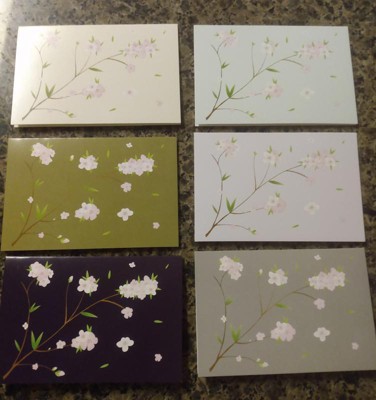 [This review was collected as part of a promotion.] I love the idea with black note cards. You can use best paper greetings for various different occasions. Smooth writing paper. Light gloss. Hard fold. Envelopes are basic. I had hoped for different japanese blossom designs but they are all the same with different backsplash.