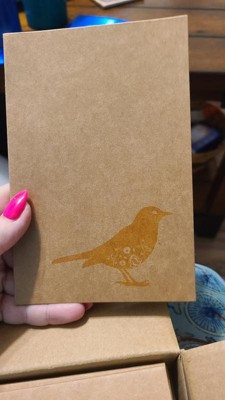 [This review was collected as part of a promotion.] Some of the birds are a bit faint like the gold bird but it's all in the rustic charm of the brown craft paper look. The card and envelopes are both nice and thick yet easy to write on. I like have the variety of different colors of birds and the 36 count that came in the box will last a good long time and can be used for many different occasions!