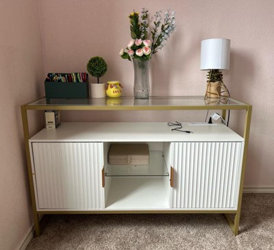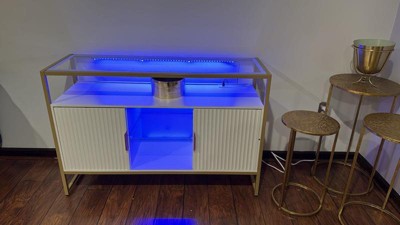 [This review was collected as part of a promotion.] Gorgeous, gorgeous, gorgeous if I needed to use one word to describe how beautiful this cabinet is and how many ways it’s can be styled and used for. The sleek design with the glass top and the lights, the white with the gold accents just beautifully done. The material is sturdy and expensive looking and to top it all off the access to an electric outlet to create maybe a coffee station, a bar anything you can imagine using it for.