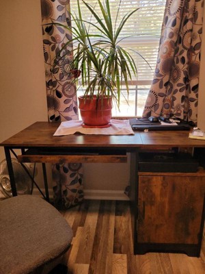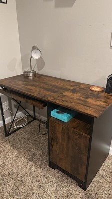[This review was collected as part of a promotion.] The computer desk is very sturdy on a metal frame. It's a beautiful color and matches any decor perfectly. I love how much room it has between my computer chair and the pull out drawer for the keyboard. I don't feel squished in. The only thing I was bummed about is my computer tower doesn't fit in the cabinet it was too small. It was good for lots of storage of my office supplies though that usually would have to be out in the open. Overall, it's very sturdy and durable.