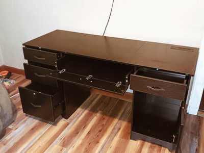 [This review was collected as part of a promotion.] This 60"W Executive Computer Desk was pretty easy to put together. It did take a couple of hours, but the instructions were clear, and all the parts were labeled correctly, which made the process smooth. I really like the built-in power strip with three outlets, a USB port, and a C charger port—it’s super convenient for keeping devices powered without extra clutter. The drawers give plenty of storage space, and overall, the desk feels sturdy and functional. The only drawback was that the lockable drawer was missing a screw, so I wasn’t able to fully assemble the locking mechanism. Other than that, it’s a great desk that looks nice and works really well for daily use.