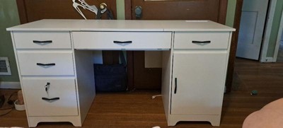 [This review was collected as part of a promotion.] I received this desk in exchange for my honest opinion. At 60” long, this is a nice desk with plenty of surface area. It has two small drawers, one medium size drawer, and a door with storage. It also has a drawer for files that can be locked to keep personal info safe. I will say the lock was a little tricky to put on, and we had to work with it a bit to get it to lock and unlock properly. It ended up working fine. The top middle drawer slides out, but also has magnets on the front face of the drawer that allows it to be pulled down flat for a keyboard. Love that it has a cord that supplies power to the top right of the desk. You can plug your computer in or a coffee warmer, or whatever you choose, and you can also charge your phone with the USB port. The desk came in a big box with lots of pieces to put together. My daughter and I put it together in about three hours. The instructions were very easy to follow, and all the tools needed were included in the box. All bags with parts were clearly labeled and had extra pieces. The handles are of good quality as well and went on easily. I would recommend this desk. I would also suggest putting it together where you have space to spread out.