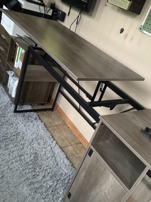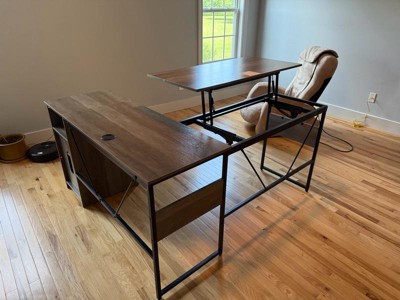[This review was collected as part of a promotion.] So the overall look of this desk is nice. I love the color and style. For the most part it went together easily however as shown in the photos no matter what you do, parts do not line up along the top of the desk. Wouldn’t be bad if it was somewhere you couldn’t see but on the top of the desk it makes it hard to ignore. The part of the desk that lifts for standing goes down fast until about halfway then it goes very slowly. I’m not sure if it’s made like that so it doesn’t slam your fingers in it or not. Moving the desk once assembled is pretty hard. It is not sturdy at all, so I highly suggest putting it together close to where you will be putting it. Thankfully I did that. You can put it together a few different ways, to have a corner desk or a straight desk which I really liked. The little cabinet can store quite a bit of stuff.