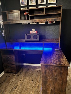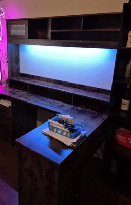 [This review was collected as part of a promotion.] Nice roomy desk with hutch. I love the strip light on the hutch which is coloring changing and has a remote. It also has a power strip built in on the top of the desk, so you can plug in items. Like printers , computers etc.