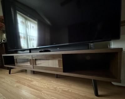 Beautiful TV stand and it feels well made! I like how there are 6 legs to hold up the stand, making it feel sturdy. The color is as expected and it was easy to put together! There were some scratches on the doors, but it’s minor and not easily noticeable. Tip: the black strip is the front of the stand, so make sure to put it together accordingly! Glad I got it on a discount 💛
