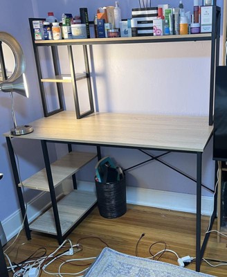 [This review was collected as part of a promotion.] This is an attractive, modern looking desk. The desk surface goes with the accents in my room. I like the light wood. One thing I like about this desk is all the shelves. There is plenty of space for all my stuff. It was fairly easy to assemble. The desk is going to be my combination vanity and desk for school. It is a sturdy desk. Would recommend!