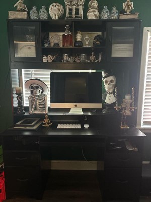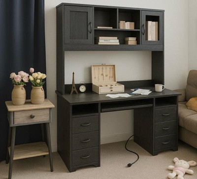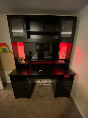 [This review was collected as part of a promotion.] This is a huge desk with hutch, it stands 7ft tall after assembly. Comes with a colored led light strip and remote so you customize them to your liking. The built in power strip allows you to charge 3 powered devices and 2 usb devices at once. Lots of shelves for displaying your items, and 2 file drawers. Makes a great addition to any home or office.