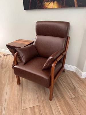 [This review was collected as part of a promotion.] I received this armchair and I absolutely love it. It goes great with our mid century modern living room. The leather is nice quality, and we find the chair very comfortable. My daughter didn’t like the detachable cushions, but I find them useful for lumbar support. Bottom line is they are removable if desired. My husband put it together quickly and noted he wished there were the little round wooden pieces to cover the screws. But overall an awesome chair and we may get another one.