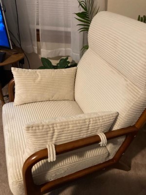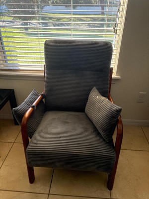 [This review was collected as part of a promotion.] The chair looks great and the corduroy fabric feels really soft. The cushion is firm and supportive, not too soft or squishy, which my back appreciates. The sturdy, brown wooden frame fits my room aesthetics perfectly. The armrest is a bit tricky as it moves around because of a gap on the side. Assembly was a little frustrating since some holes on one side didn't align well and the screws were kind of small. Still, I think it’s a good chair especially because of the support it provides. It's a solid option for additional seating in a study but not the kind you sink into for lounging.