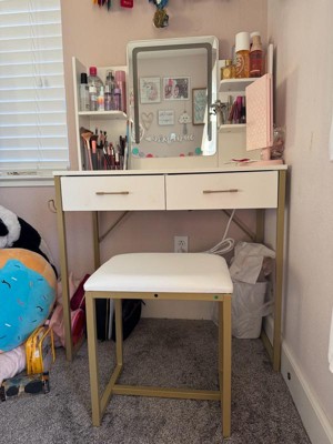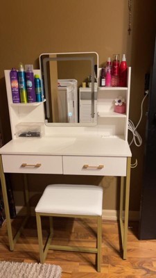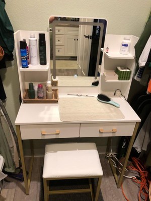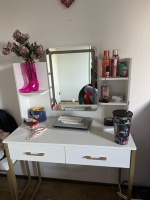 [This review was collected as part of a promotion.] In love with this vanity! It’s perfect size since it isn’t too big or too small, it has 2 drawers to add some makeup, it’s has three different brightness lights, and 2 shelves as well!