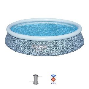 SWIMMING POOL SET: 13"X 33" - With this quick and easy Bestway Fast Set Pool, you’ll be ready for a pool day in no time! The Fill & Rise set-up process is simple - just select a level surface, inflate the top ring and the pool will rise as it’s filled up with water. The sturdy Tritech liner is made out of an ultra-durable 3-layer material that is reinforced for strength and is 85% more puncture-resistant than PVC. The attractive liner also features an abstract line print that will bring a classy look and feel to your backyard. When the season’s over, storage is fast and simple. The water releases easily through the flow control drain valve, and then the pool can fold up for compact off-season storage. Also included with the set is a filter pump to help keep the water clean. This pool is the ideal choice for families looking for a quick and easy pool option for their backyard. Kids will enjoy spending their summer days splashing and playing in the water, and parents can enjoy a nice and relaxing dip as well. The season won’t be complete without the convenient Fast Set Pool from Bestway! Tritech enhanced 3-layer liner is reinforced for puncture-resistance, durability and longevity. Fill & Rise Pool - Select a level surface, inflate the top ring, and the pool will rise as it’s filled up with water. Simply attach a hose to the built-in control valve to drain water. Size: 13 ft. x 33 in. Water Capacity (80%): 1,939 gal. Includes 530 gal. filter pump.