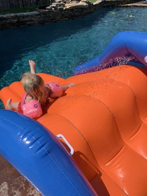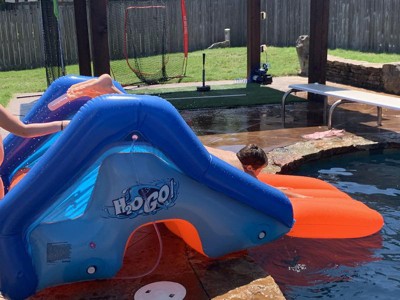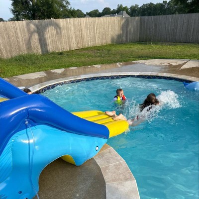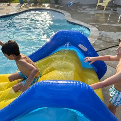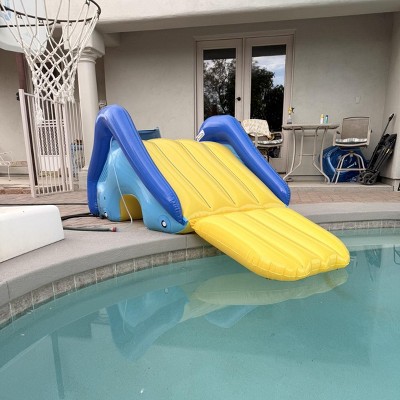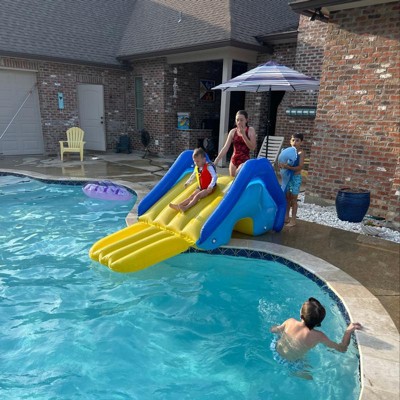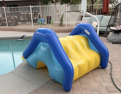 [This review was collected as part of a promotion.] This is a great addition to our backyard pool and kids cant wait till summer when we open our pool. Large and sturdy slide that fits right at pools edge and extends into water so you can avoid getting hurt at the edge of the pool. Easy to inflate/deflate and can easily hold a few children on it (altough we will have a one at a time rule)