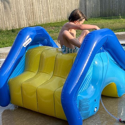 [This review was collected as part of a promotion.] My kids have been using this slide for a little over a month and continue to enjoy it just as much as they did the day they got it. It has a nice easy spout to air up the slide. It can be filled with water on the bottom to keep it stable. The water hose attaches to it to keep the slide wet so they slide down with ease. It can also float in the pool like a island and the kids have so much fun climbing on it.