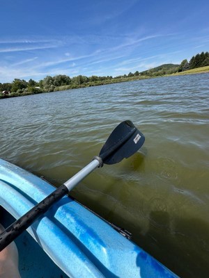 [This review was collected as part of a promotion.] I have always used a one-piece kayak paddle, so I was dedicated to try this aluminum paddle that could be taken apart for travel easily. The paddle itself is all aluminum with the exception of the rubber grips on the shaft and the plastic blades. I began assembly by spending about 15 minutes taking off thick plastic wrapper that covered the entirety of all three pieces of the shaft. I found this plastic excessive, unnecessary, not eco friendly. The pieces were already in a plastic bag to keep them safe from the elements. Once I got the plastic wrapper off, the paddle itself went together in about a minute. Easy peasy! It even had little plastic pieces near the blades to keep the water from running down the handle, which I appreciated. I then took the paddle out with me on a short kayak ride on a lake on a very windy day. The paddle seemed a little flimsy when I was trying to use it to push myself out into the lake, so I was a bit skeptical. Once I got out there and started paddling, though, the paddle’s blades glided through the water with ease, even in the face of a strong headwind. It felt sturdy enough to power me through the water just as the more expensive, heavier paddles I’ve used. Overall, I was pleased with this paddle and enjoy the fact that it is easily taken apart and put together for transport, unlike a traditional paddle.