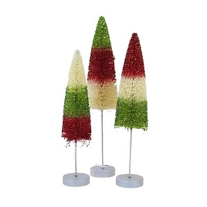 Add a splash of retro charm to your holiday decor with the Brights Retro Long Stem Tree by Bethany Lowe. This 12-inch tall bottle brush tree features narrow striped layers in cheerful red, cream, and green, with sparkling glitter-tipped ends that shimmer under the lights. It’s perched atop a long, twisted wire trunk and mounted on a silver wooden base for a whimsical vintage feel. Perfect for adding playful height and festive personality to your Christmas display. Measures Approximately 12 In H X 2.5 In W X 2.5 In D (HxWxD). Includes 3 Trees.