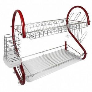 The Better Chef 2-Tier Chrome Plated Dish rack is made of rust resistant stainless steel with an attractive chrome finish. The silicone feet protectors will keep the rack steady so there will be no wiggles and wobbles bringing your plates crashing down. With the plastic draining tray, your counter will be safe from the drips of the drying dishes, so no wasting paper towels on clean up after you've put your dishes away. The DR-165R even has a mug stand for a few cups and cutlery holder for all your forks, spoons, knives, and kitchen utensils. Perfect for small families, its 18 plate capacity will make sure you're able to complete a full load of dishes in just one go, no more waiting for half to dry and finishing the rest later. Just set your dishes on the rack and let them dry in style!
