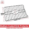 The Black Coated-Steel Medium Sink Protector from Better Houseware safeguards your sink from scratches from cookware, dishes, and cutlery. It also has coated feet to protect the sink from scrapes. The sink rack protects dishes and delicate stemware, and keeps them above the draining water. It has a center opening for access to the sink’s removable drain.