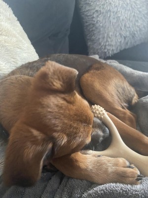 We started giving our pups these bones a few months ago and they absolutely love them. Our pitties do perfect with the "hard" bones as they are strong enough to last for them. So happy we found them on Target. This is our youngest pup who even sleeps with her BetterBone and carries it everywhere. Best dog chews out there!