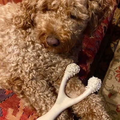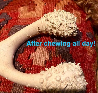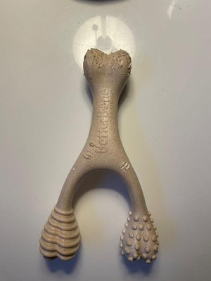 This toy is ingenious! Based a a concept similar to the hard compostable utensils made from corn and potato, this safe tough chew toy has NO NYLON. Made from dehydrated beef and plant starch, it is made to flake off small particles which can be ingested. I had been buying pricey collagen sticks which Smudgie consumes in an hour. That gets expensive. He had been chewing this Better Bone non stop since it arrived in the delivery! Most importantly… this is safe! And Smudgie LOVES IT! I am impressed with the ingenuity and care the inventors showed. I am thrilled and Smudgie is, too! The three pronged wishbone shape is easy to grab. At 20 bucks for the large one, I thought at first is was high priced. But seeing that it will probably last a good six months or more, it’s truly a bargain. I will be buying more forever!