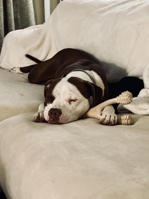 We started giving our pups these bones a few months ago and they absolutely love them. Our pitties do perfect with the "hard" bones as they are strong enough to last for them. So happy we found them on Target. This is our youngest pup who even sleeps with her BetterBone and carries it everywhere. Best dog chews out there!