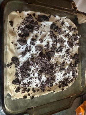 [This review was collected as part of a promotion.] The "cake" or middle portion of this dessert is basically, in my opinion, a pudding like mixture that tastes just like the Oreo filling. When refrigerated for a while, it is at its best. Then, if you let it freeze for a few minutes, you end up with a mixture that tastes like and appears to be the white filling itself, with crushed Oreos mixed throughout. It makes me wonder if it actually is made up of the exact same thing that the white filling is made of. It's certainly close. If there is something I would improve or change with this dessert, it would be the consistency of the included Oreos. They are already crushed, to an extent. However, they are not crushed well. There are large pieces throughout the mixture, some that are very nearly an entire in tact cookie.. I would like to see this crushed up completely, into a cookie crumble. This of course can be done yourself before opening the cookies, I know. So it's not really a big deal. Overall, I would call this dessert very good, but not as good as it could be. One other thing is the amount you end up with. I would love to see a portion that is slightly larger. If you are a big Oreo fan, you should love this dessert!