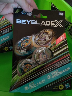 - HARNESS THE POWER: Includes 2 Takara Tomy-designed Beyblade X tops with authentic die-cast metal parts: Bite Croc 3-60LF Right-Spin Attack Type and Sting Unicorn 4-60P Right-Spin Balance Type