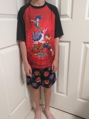 • MAGNIFICENT CHARACTER AND SPINNER TOP DESIGN - This incredibly unique 2-piece Beyblade pajama set for boys features a short sleeve top and shorts. The Beyblade tee shirt features a large detailed front design of the antagonist brothers Hikaru and Hyuga Hizashi launching their spinner tops! The shorts have an allover design or the 2 brothers spinner tops, King Helios Zone and Super Hyperion Xceed.