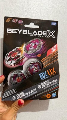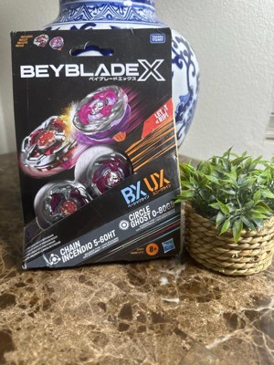 - INTERCHANGEABLE DIE-CAST BLADES: Includes Takara Tomy-designed Beyblade X top with authentic die-cast metal parts: Circle Ghost 0-80GB UX Right-Spin Stamina Type and Chain Incendio 5-60HT BX Right-Spin Balance Type