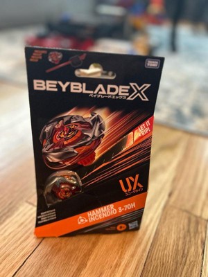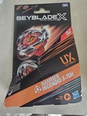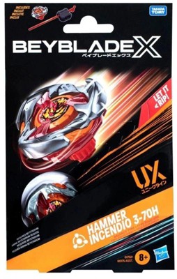 - INTERCHANGEABLE DIE-CAST BLADES: Includes Takara Tomy-designed Beyblade X launcher and top with authentic die-cast metal parts: Hammer Incendio 3-70H UX Right-Spin Balance Type. The hefty smash blade slams opponents around the stadium while the bit keeps it stable