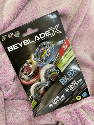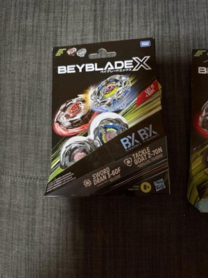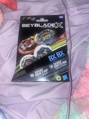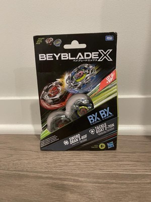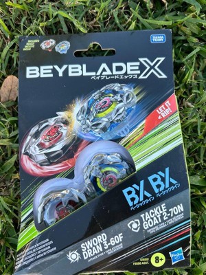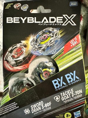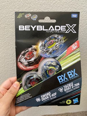 - INTERCHANGEABLE DIE-CAST BLADES: Includes Takara Tomy-designed Beyblade X top with authentic die-cast metal parts: Tackle Goat 2-70N BX Right-Spin Defense Type and Sword Dran 3-60F BX Right-Spin Attack Type