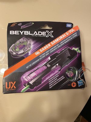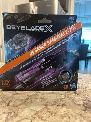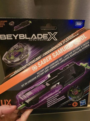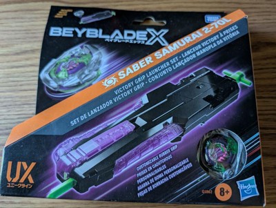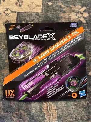 Experience Beyblade X, the next generation of Beyblade stadiums, launchers, and tops! The Victory Grip Launcher Set includes a right-spin launcher with a 10"" (25cm) ripcord and customizable rubber grips. It comes with the Saber Samurai 2-70L Right-Spin Attack Type top, which works with the X-Celerator Gear System to level up your game and prove it in battle! When the top’s gear engages the X-Celerator Rail of a Beyblade X Beystadium (sold separately), it can super-accelerate into an Xtreme Dash around the arena for crushing collisions and epic bursts. Bladers launch their top against their opponent’s top to score points – first to 4 points wins. Mix and match the interchangeable blade, ratchet, and bit with those of other Beyblade X tops (sold separately) to create your own unsurpassable Bey. Hasbro Beyblade toys with authentic Takara Tomy die-cast metal tops make great kids gifts for boys and girls ages 8 and up. HASBRO and all related trademarks and logos are trademarks of Hasbro, Inc.