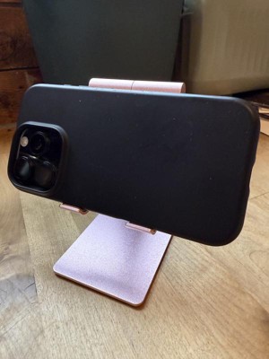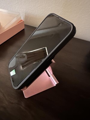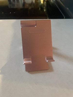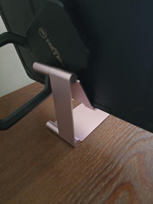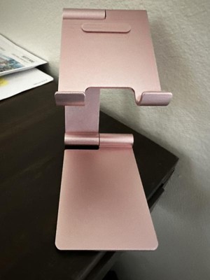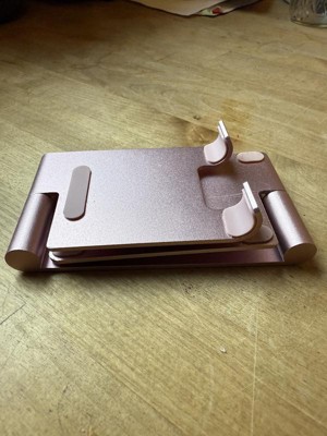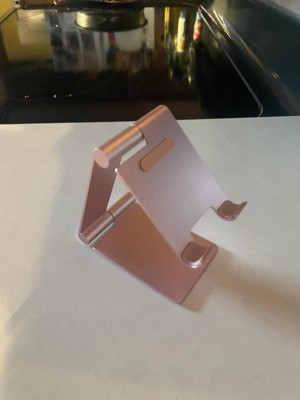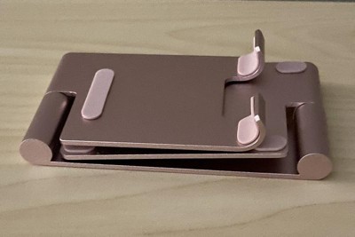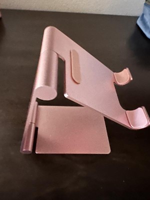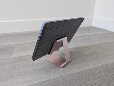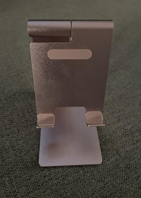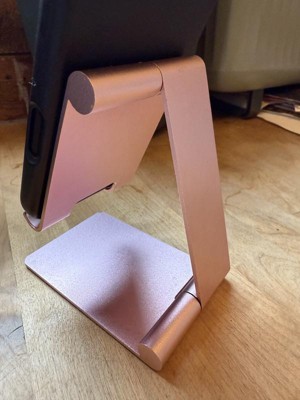 We have been loving this little folding stand. Hold phones and tablets both. Has nice firm hinges that you can adjust easily and holds up well to being typed on while in the stand. Folds up super small. Love that it’s all metal with some grips.