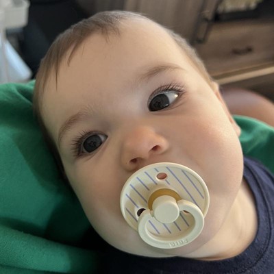 [This review was collected as part of a promotion.] This is the Bibs studio collection colour stripe latex pacifier in size 2 for 6 months and older. This is a 2 pack, however the price is much higher than many other brands. These have a natural rubber top that is round similar to a child feeding from their mother. I love the design and color options available, and these come in a smaller size for brand new babies as well. I received an incentive to write this review.