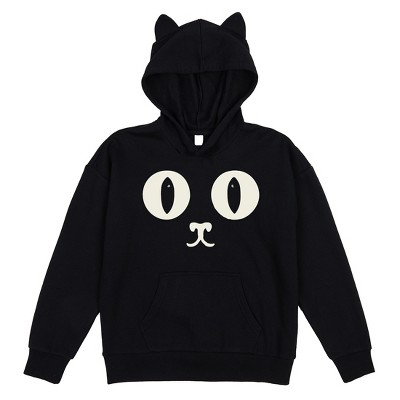 Add a touch of fun to everyday wear with this youth girl's black long sleeve hooded sweatshirt featuring a big cat face on the front. The adorable design is accentuated by playful 3D cat ears on the hood and a cute collar at the neck, making it a standout piece. Crafted from a cozy cotton and polyester blend, this sweatshirt is durable and perfect for active kids. The double-lined hood offers extra warmth. For simple care, machine wash it on cold with like colors and tumble dried on low heat.