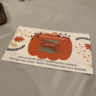 Happy Thanksgiving Scratch-Off Cards INCLUDES 22 fall harvest party game cards: 20 "loser" cards and 2 "winner" cards. FUN PARTY GAME: Happy Thanksgiving scratch-off cards will be enjoyed by fall harvest party guests of all ages. Each game card measures 2.75" tall x 4.75" wide. Winner and loser game cards are packaged separately so it is easy to pre-select the game winners if you choose. 3 WAYS TO PLAY: Simple - Greet guests as they arrive and hand them a scratch-off card. Quick - Display one scratch-off card at each place setting and have guests play before eating. Favorite - Give scratch-off cards out as mini prizes during other party games. The winning scratch off card(s) gets a grand prize. HIGH-QUALITY PARTY SUPPLIES: Happy Thanksgiving Scratch-Off Cards are professionally printed on heavy-duty cardstock paper with a photo-like shine. They are individually inspected and carefully packaged by hand, with winner cards and loser cards clearly marked. This fun fall harvest party game will arrive ready to use at your party. MADE IN THE USA: Happy Thanksgiving - Fall Harvest Party Game Scratch Off Cards are designed and manufactured at our Wisconsin facility using materials that are Made in the USA.