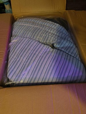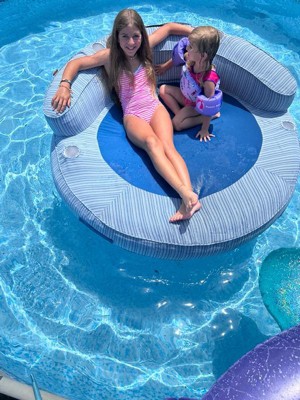[This review was collected as part of a promotion.] Huge pool float to fit two or three people. Nice blue and white old school stripped design on the pool float. Very nicely made, decent material and quality. Easy to put together.